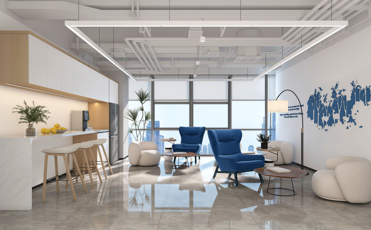 以極簡風鋪陳辦公空間:前廳用大理石墻 + 金屬字,簡潔襯出企業(yè)質(zhì)感;休閑區(qū)以藍白撞色軟裝,搭配通透采光,松弛又現(xiàn)代;會議室木調(diào)柜體 + 利落線條,實用中透著雅致。整體以低飽和色調(diào)、通透材質(zhì),讓辦公空間兼具專業(yè)與舒適