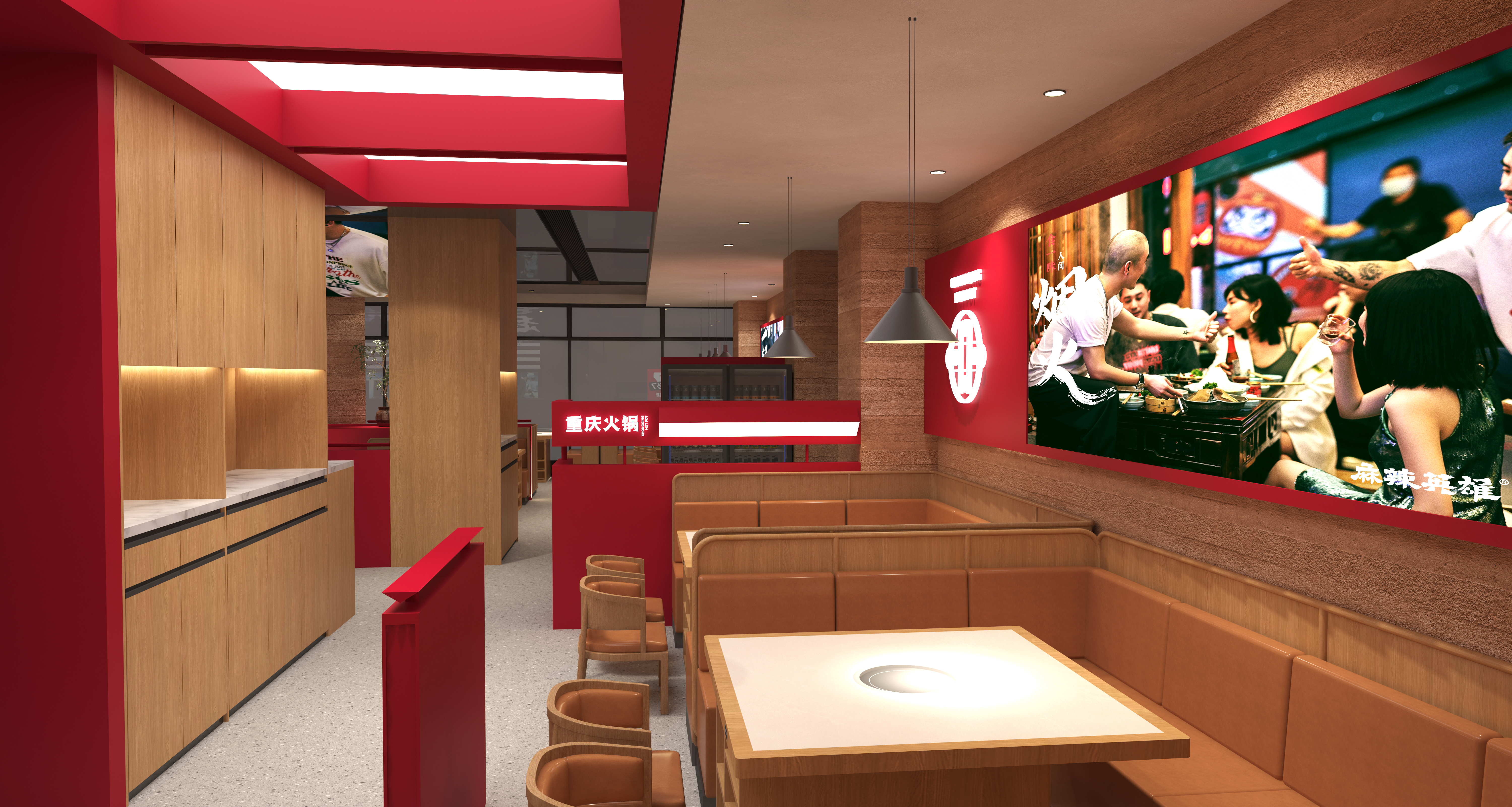 以紅棕撞色鋪就熱辣底色,木質(zhì)隔斷劃分出松弛的用餐尺度,高挑空設(shè)計(jì)讓煙火氣自在流轉(zhuǎn)。開放式明檔串聯(lián)起后廚與前廳,暖光吊燈與藝術(shù)燈箱交織出明暗層次,綠植與手繪標(biāo)語點(diǎn)綴其間,把重慶街頭的熱辣煙火揉進(jìn)現(xiàn)代餐飲空間。每一處動(dòng)線與材質(zhì)的碰撞,都在訴說 “麻辣之外,更懂溫度” 的空間哲學(xué)。